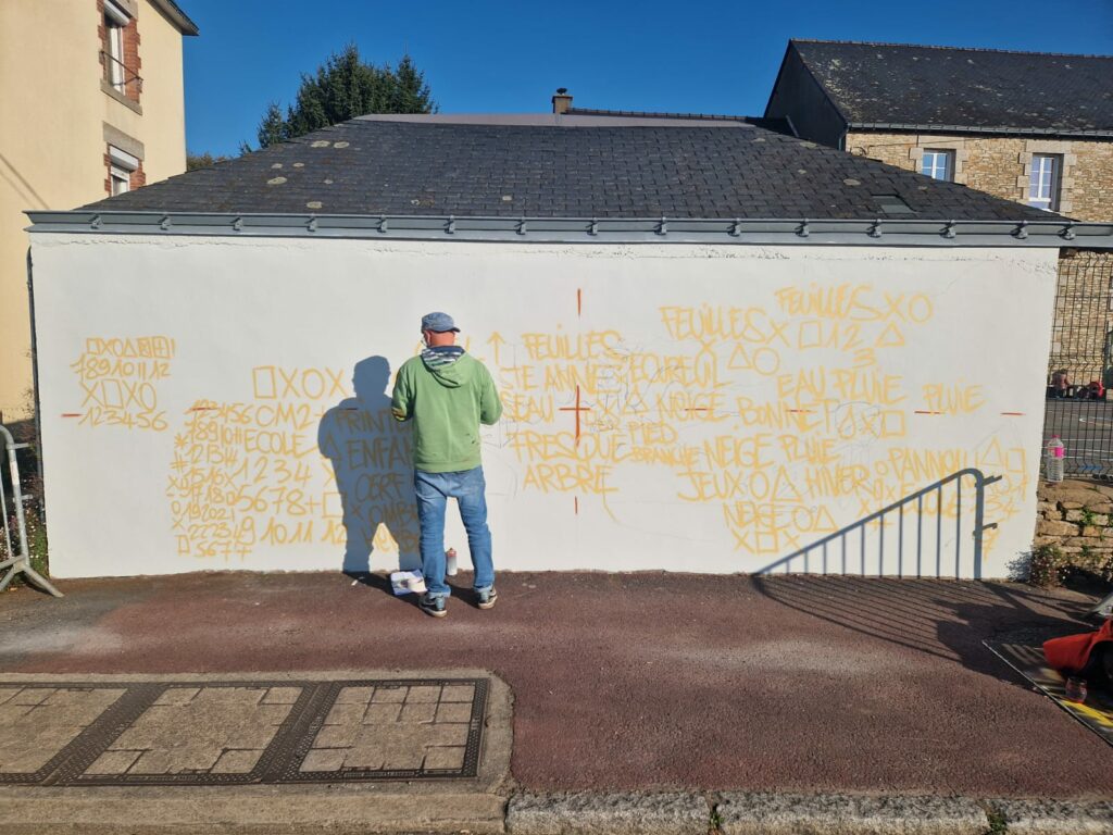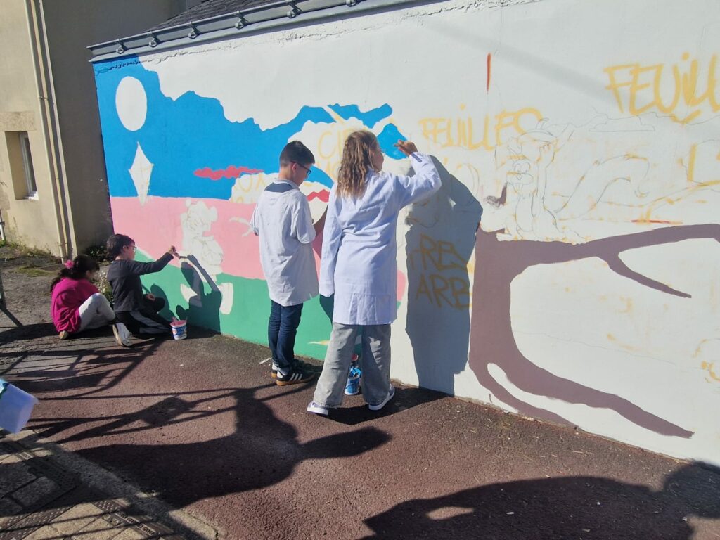 Nous avons retravaillé la fresque par groupes, pour ajouter des détails et améliorer notre composition. Puis nous avons créé des pochoirs. Enfin, la semaine avant les vacances de la Toussaint, nous avons peint la fresque avec Jef, comme de vrais artistes : un moment très spécial et dont nous nous souviendrons longtemps.