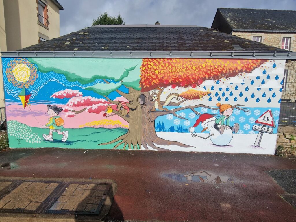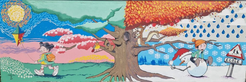 Ensuite, nous avons préparé une production personnelle pour mettre en images nos idées. Puis Jef est revenu à l’école pour imaginer avec nous le début de la fresque. Petit à petit, le projet a pris forme avec pour idée principale, un travail autour des saisons.